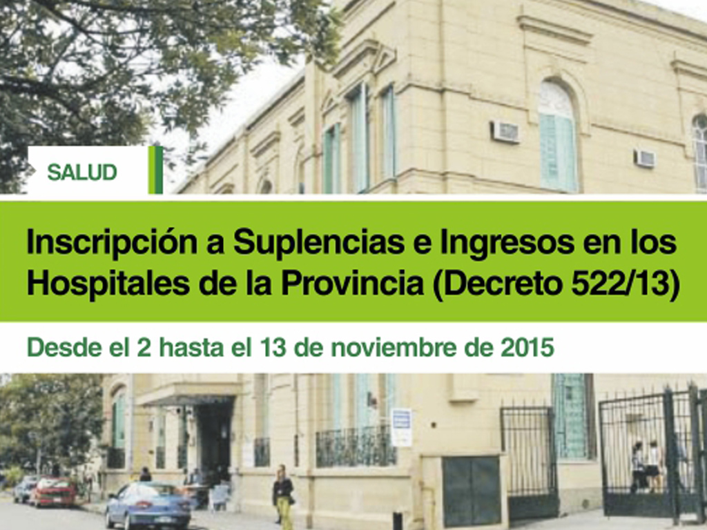 Del 2 hasta el 13 de noviembre de 2015 se abre la inscripción a Suplencias e ingresos en los Hospitales de la Provincia (Decreto 522/13). Un logro de ATE por la aplicación de este Sistema acordado en Paritarias y que garantiza transparencia e igualdad de oportunidades para ingresar a Hospitales y Centros de Salud.