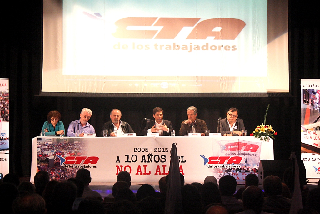 ↵La actividad conmemoró el décimo aniversario de la Cumbre de las Américas realizada en Mar del Plata y que gracias a la decisión y liderazgo político de los presidentes Néstor Kirchner, Lula Da Silva y Hugo Chavez, derrotó las aspiraciones norteamericanas de rubricar un tratado de libre comercio en el continente. El plenario realizado en la ciudad de Buenos Aires contó con la presencia del Ministro de Economía de la Nación, Axel Kicilloff; el Secretario de la Central, Hugo Yasky, el Secretario adjunto y Secretario General de ATE Santa Fe, Jorge Hoffmann, la Secretaria de Contabilidad y Finanzas de la CTA, Sonia Alesso y más de un centenar de dirigentes y trabajadores de todo el país.