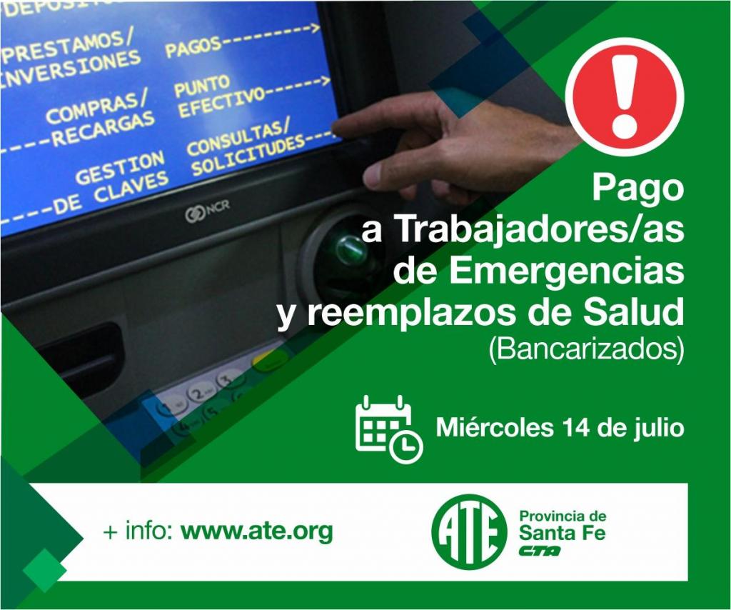 La Asociación Trabajadores del Estado -ATE- Santa Fe informa que el Gobierno Provincial confirmó que este miércoles 14 de julio podrán cobrar sus haberes el personal de Salud que se desempeñan en Emergencias y Reemplazos.