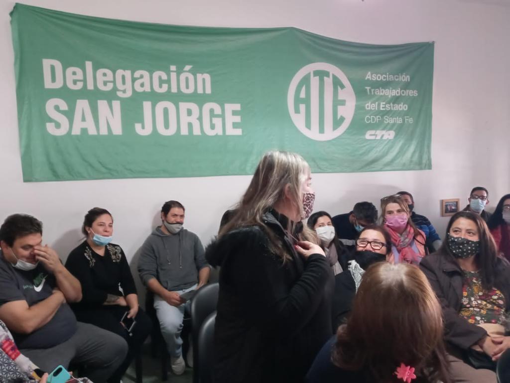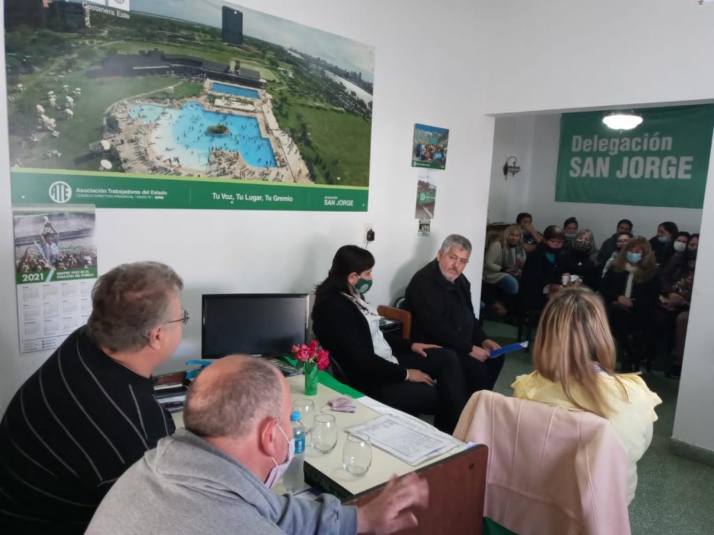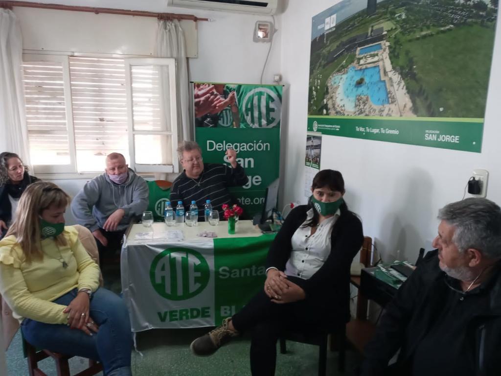 Integrantes del CDP de la Asociación Trabajadores del Estado -ATE- Santa Fe, como el Sec. Administrativo Adolfo Avallone, Darío Galarza, Secretario de Interior, y referentes de Asistentes Escolares, Paula Ovelar y de Salud, Cristian Rosas y Desiré Gigena, se reunieron con delegados/as y afiliados/as de San Jorge y alrededores, como Sastre, Piamonte, María Susana, Carlos Pellegrini, El Trébol, Landeta, Cañada Rosquín, San Martín de las Escobas, María Juana, Castellanos, Las Rosas y Bouquet.
