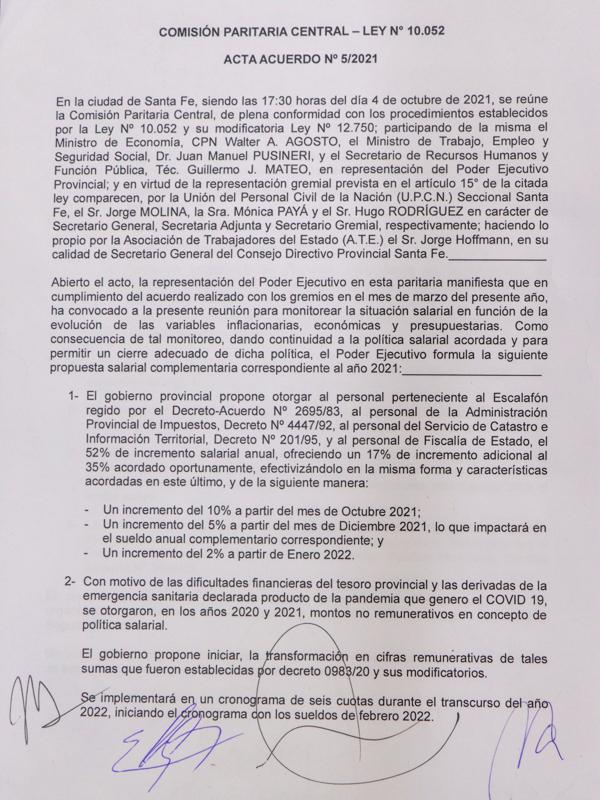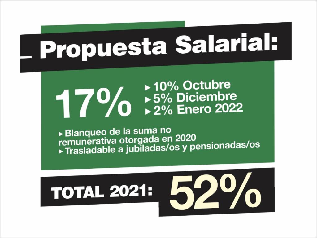 Se trata de un 17% de aumento en 3 tramos: 10% en octubre, 5% en diciembre -ambos impactan en el medio aguinaldo- y 2% en enero. Además, blanqueo de la suma no remunerativa otorgada en 2020 y nueva paritaria en febrero.