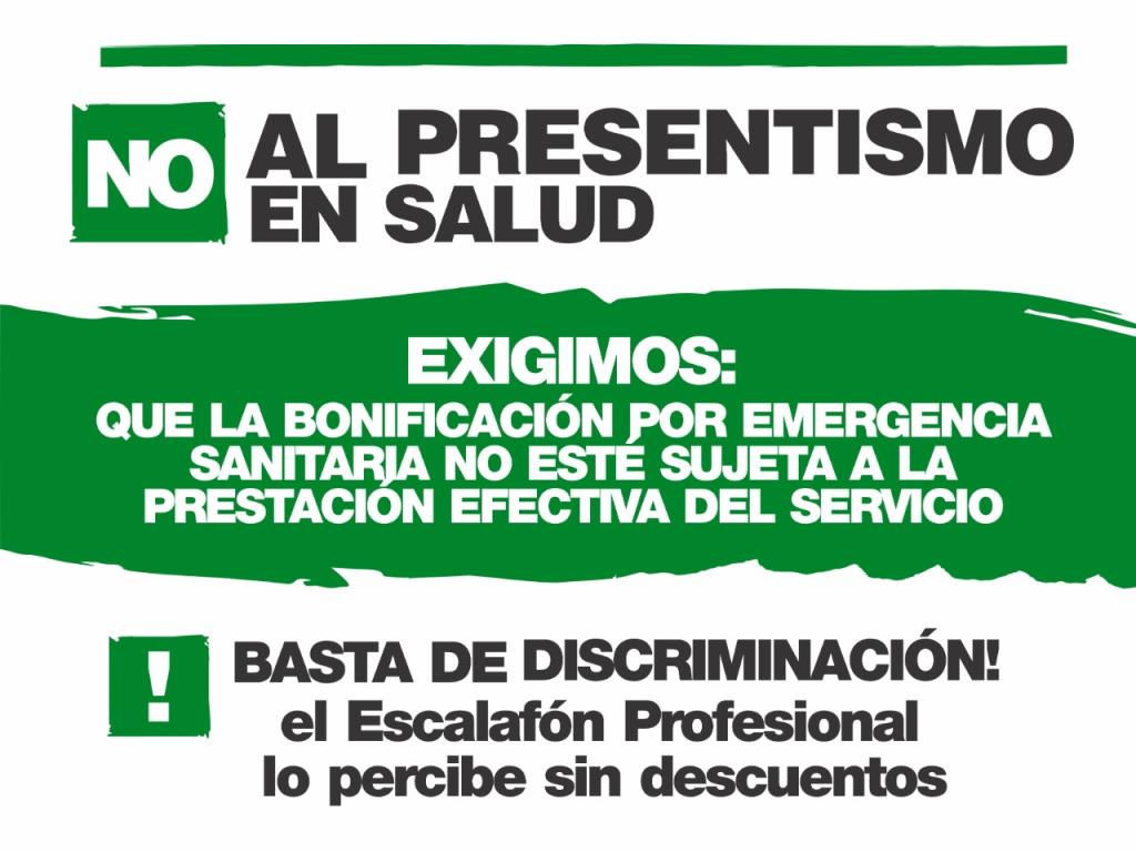 Desde ATE exigimos que la bonificación por emergencia sanitaria no esté sujeta a la prestación efectiva del servicio. Basta de discriminación. El Escalafón Profesional lo percibe sin descuentos. No al presentismo en Salud.