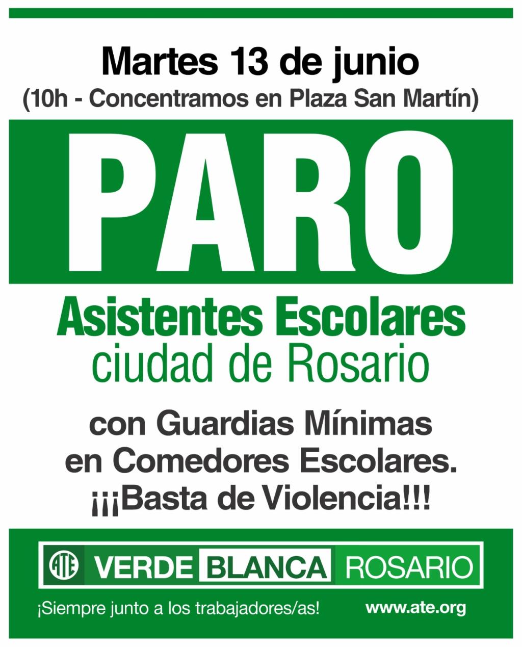 El paro dispuesto para el Martes 13 de Junio en las Escuelas de la ciudad de Rosario se realizará con guardias mínimas en los Comedores Escolares para garantizar el servicio alimentario.