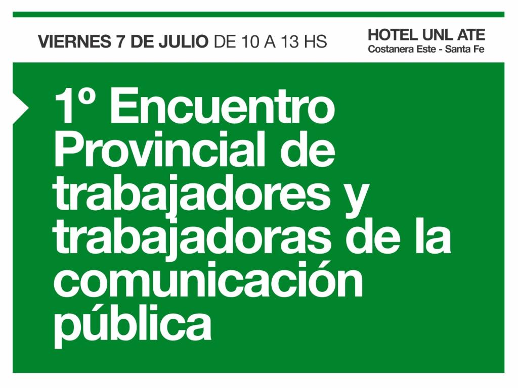 El viernes 7 de julio de 10 a 13 hs en el Hotel UNL ATE (Maradona 127 – Costanera Este) se realizará el 1º Encuentro Provincial de trabajadores y trabajadoras de la comunicación pública.