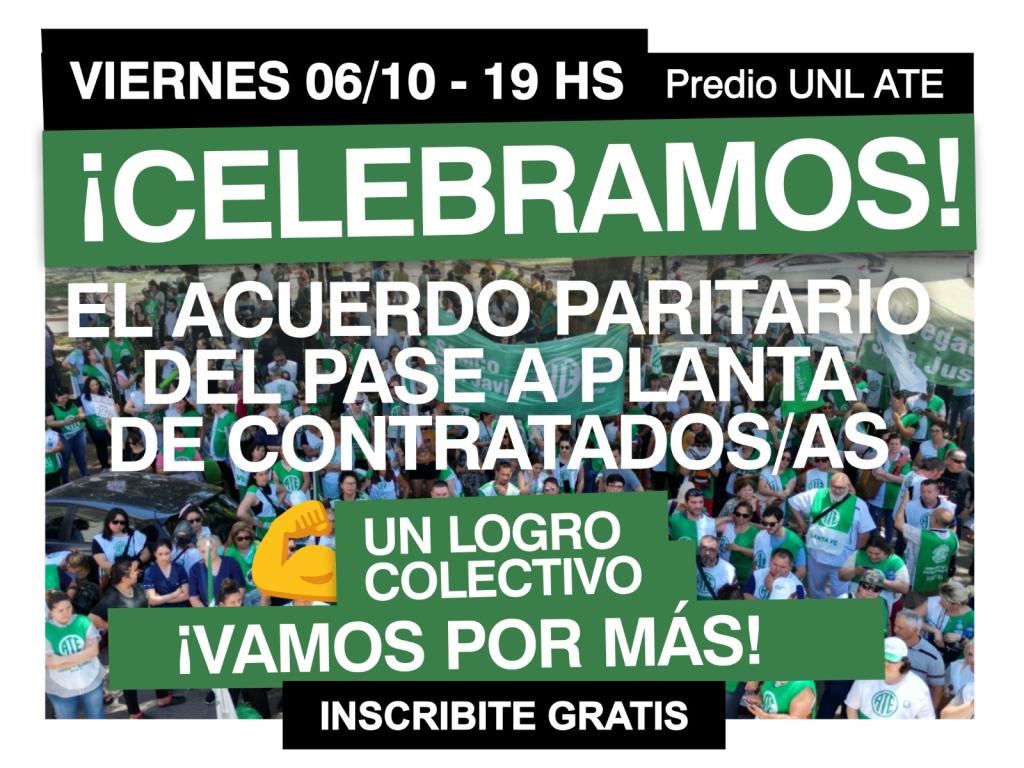 Este viernes 6 de octubre festejamos el acuerdo paritario que permitió el pase a planta de miles de trabajadores/as contratados/as del Estado Provincial. El encuentro se realizará en el Predio UNL ATE a partir de las 19 horas.