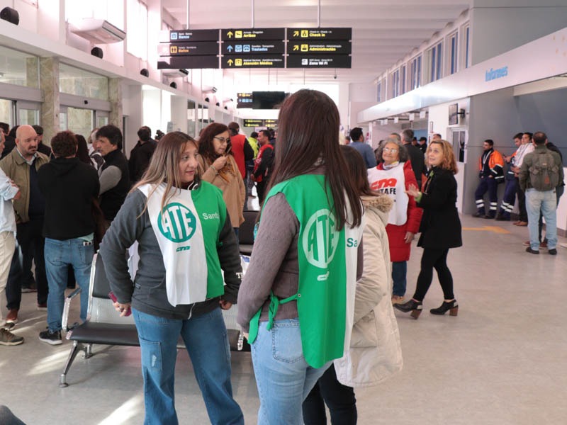 Este martes 14 de mayo integrantes del Consejo Directivo de ATE junto a trabajadores/as del APA y otros sindicatos, realizaron una concentración y conferencia en el Aeropuerto de Sauce Viejo, en rechazo a la intención de la privatización de Aerolíneas Argentinas.