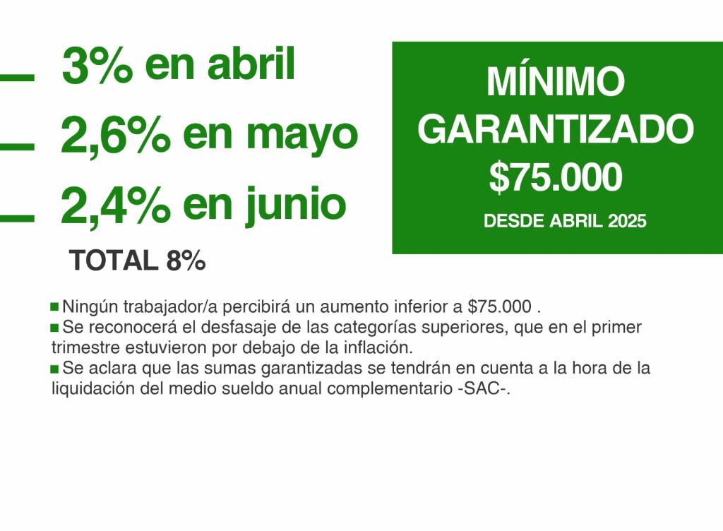 La propuesta salarial para el segundo trimestre es de un 8% y contempla un mínimo garantizado de $75.000 desde abril.