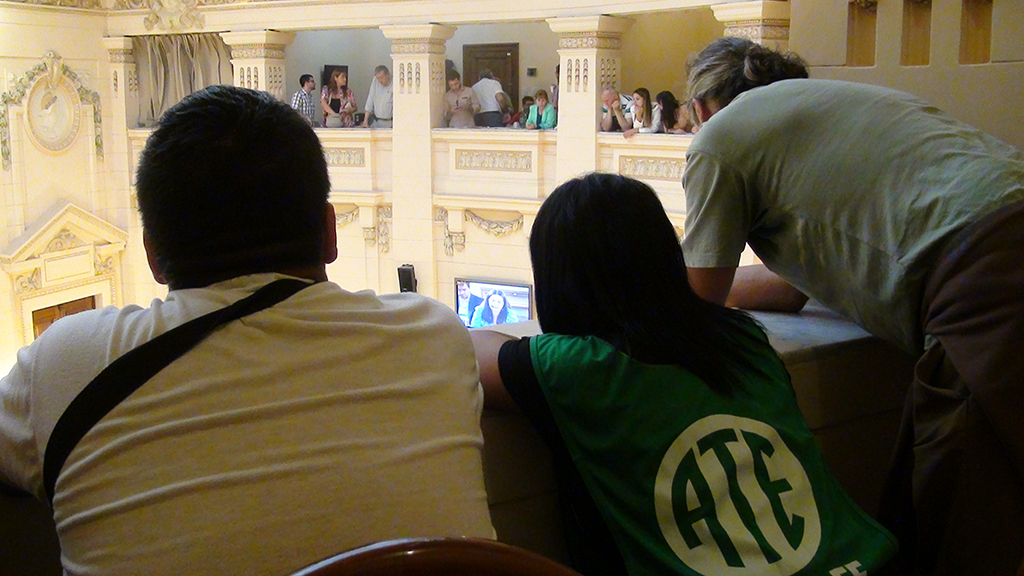En una extensa jornada, los trabajadores fueron dando testimonio de las tareas que desarrollan a lo largo y ancho de la provincia exigiendo que se termine con la precariedad laboral. El primer festejo se dio cuando el diputado que preside la Comisión de Asuntos Constitucionales, Leandro Busatto, quien estaba acompañado por el diputado José María Tessa, se dirigió a los manifestantes para comunicar el dictamen favorable al proyecto, habilitando su tratamiento previa preferencia para el tratamiento sobre tablas por parte de Asuntos Parlamentarios, hecho que ocurrió pasado el mediodía.