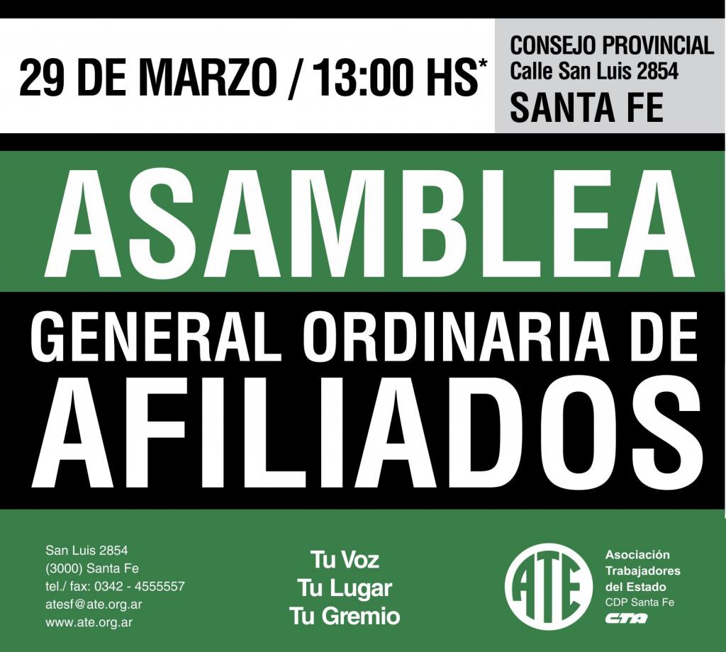El Consejo Directivo Provincial de la Asociación Trabajadores del Estado –ATE- Santa Fe CONVOCA a ASAMBLEA GENERAL ORDINARIA DE AFILIADOS, a realizarse el martes 29 de marzo, a las 13:00 horas, en la sede gremial, sito en calle San Luis 2854 de la ciudad de Santa Fe; y en un todo de acuerdo a lo establecido por el Estatuto de ATE - ArtÃculo 54 (*)