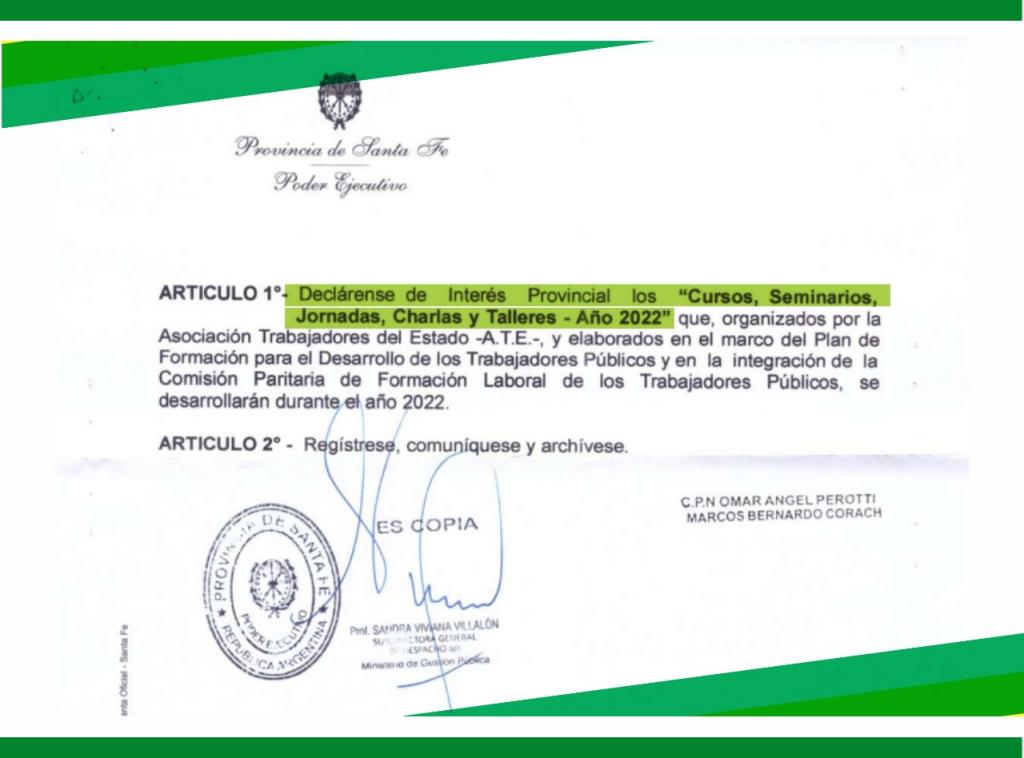En el decreto 076/22, firmado por el gobernador de la Provincia, se considera que la Asociación Trabajadores del Estado -ATE- Santa Fe “viene organizando, en el marco del Plan de Formación para el Desarrollo de los Trabajadores Públicos y en la integración de la Comisión Paritaria de Formación Laboral de los Trabajadores Públicos, cursos, talleres, seminarios, charlas y jornadas tendientes a la formación y capacitación de los agentes de la Administración Pública Provincial”.