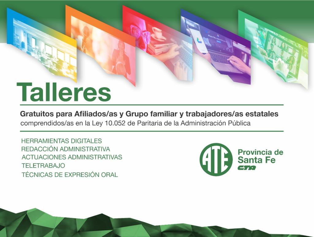 ATE abre la inscripción a la 2ª etapa de Talleres virtuales de formación para trabajadores del Estado provincial. Los talleres tienen una duración de entre 5 y 6 semanas. Se dictan en la plataforma educativa ATE Virtual a la que se puede acceder en cualquier horario y día de la semana y cuentan con materiales audiovisuales, presentaciones, foros, clases por videoconferencia, actividades, etc.