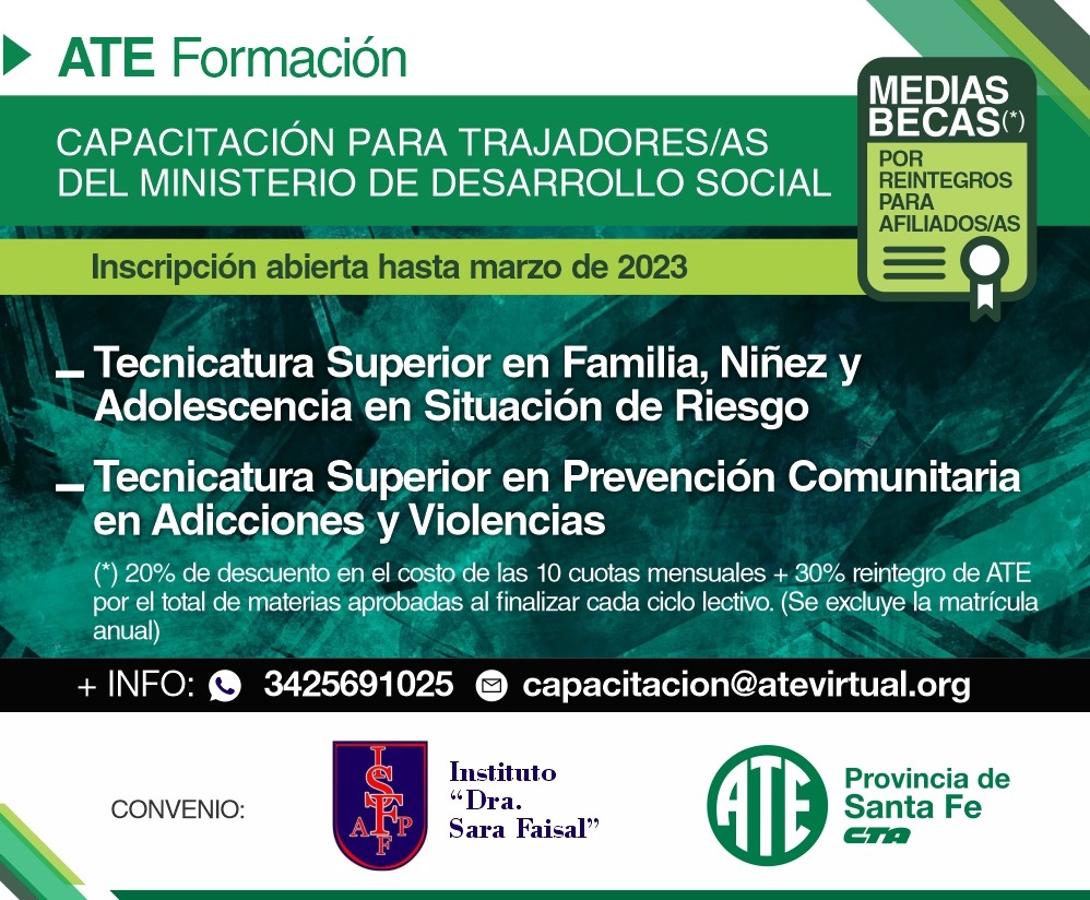 La Asociación Trabajadores del Estado -ATE- Santa Fe mantiene vigente un convenio con el Instituto Superior Nº 9105 “Dra. Sara Faisal” de la ciudad capital, para la realización de la Tecnicatura Superior en Familia, Niñez y Adolescencia en Situación de Riesgo y la Tecnicatura Superior en Prevención Comunitaria en Adicciones y Violencias.