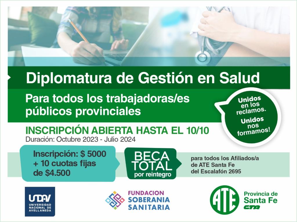 Hasta el 10 de octubre se encontrará abierta la inscripción a la Diplomatura de Gestión en Salud. BECAS totales por reintegro para los afiliados/as titulares pertenecientes al Escalafón 2695 de la provincia de Santa Fe que finalicen la carrera y descuentos y financiación en cuotas fijas para los afiliados/as a ATE, los familiares directos y para los afiliados/as a ATE de todo el país.