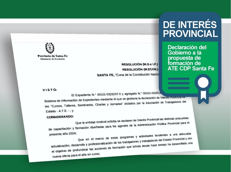 Por medio de la RESOLUCIÓN N.°: 0479 del Ministerio de Gobierno e Innovación Pública y de la RESOLUCIÓN N.°: 524 del Ministerio de Economía fueron Declarados de Interés Provincial los "Cursos, Talleres, Seminarios, Charlas y Jornadas 2024" organizados por la Asociación Trabajadores del Estado - ATE- que se desarrolla durante el actual año.