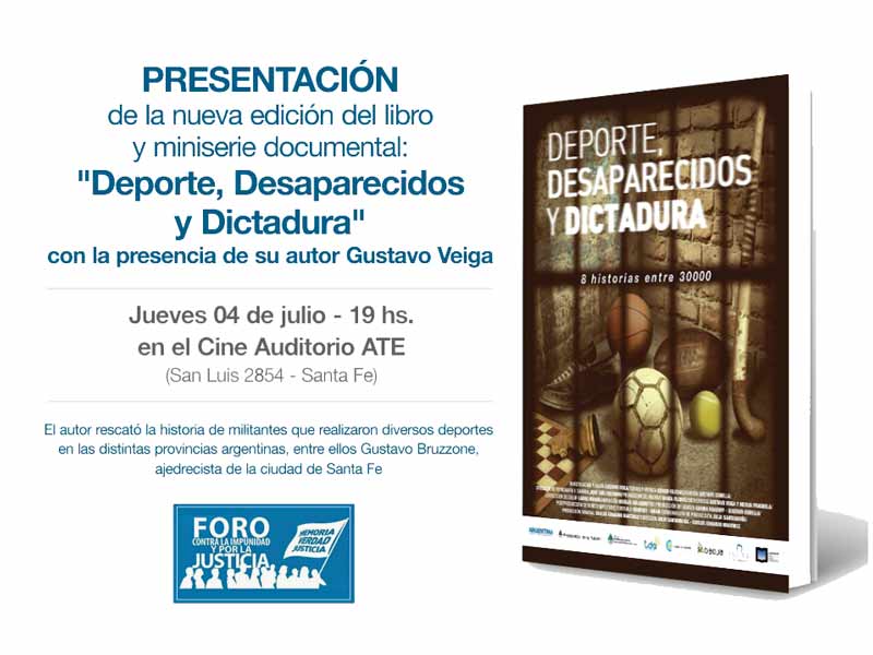 Jueves 4 de Julio a las 19:00 hs en el Auditorio de ATE, el Foro contra la Impunidad y por la Justicia, del que ATE forma parte, recibirá la presencia de Gustavo Veiga para presentar la nueva edición de su libro "Deporte, Desaparecidos y Dictadura" y la miniserie documental del mismo nombre.
