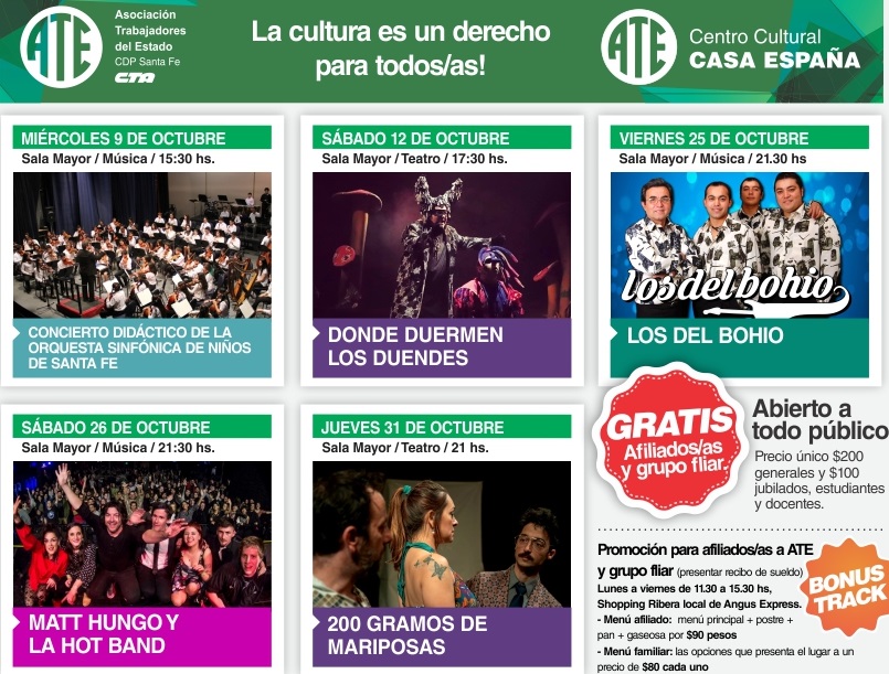 Para octubre, continuamos programando eventos gratuitos para Afiliados/as en el Centro Cultural ATE Casa España. Será un mes para reírnos, jugar con los más chicos/as, cantar, bailar y disfrutar a los trabajadores de la cultura local y regional.