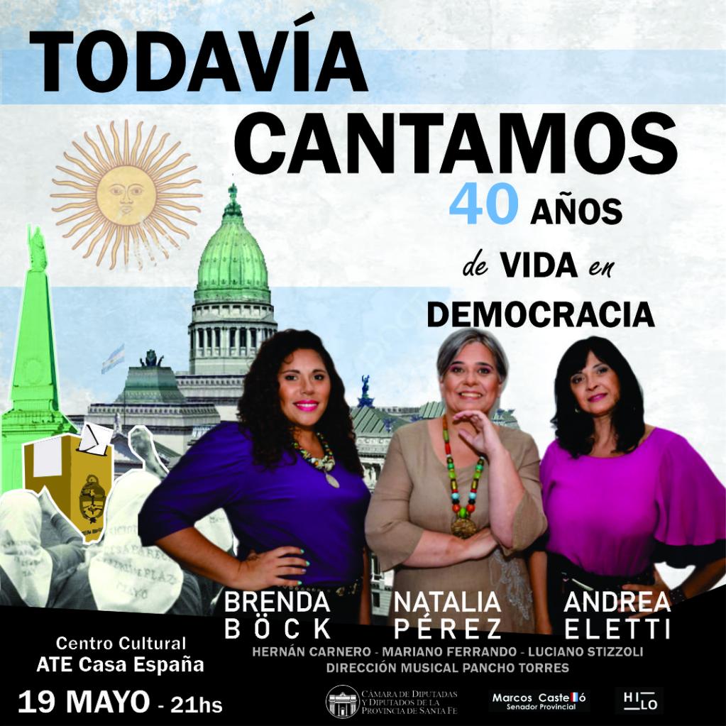 En este marco, y de cara a una fecha tan importante para nuestro país, Andrea Eletti, Brenda Böck y Natalia Pérez, junto a la dirección musical de Pancho Torres, realizarán un concierto llamado “TODAVÍA CANTAMOS. 40 años de vida en democracia”.