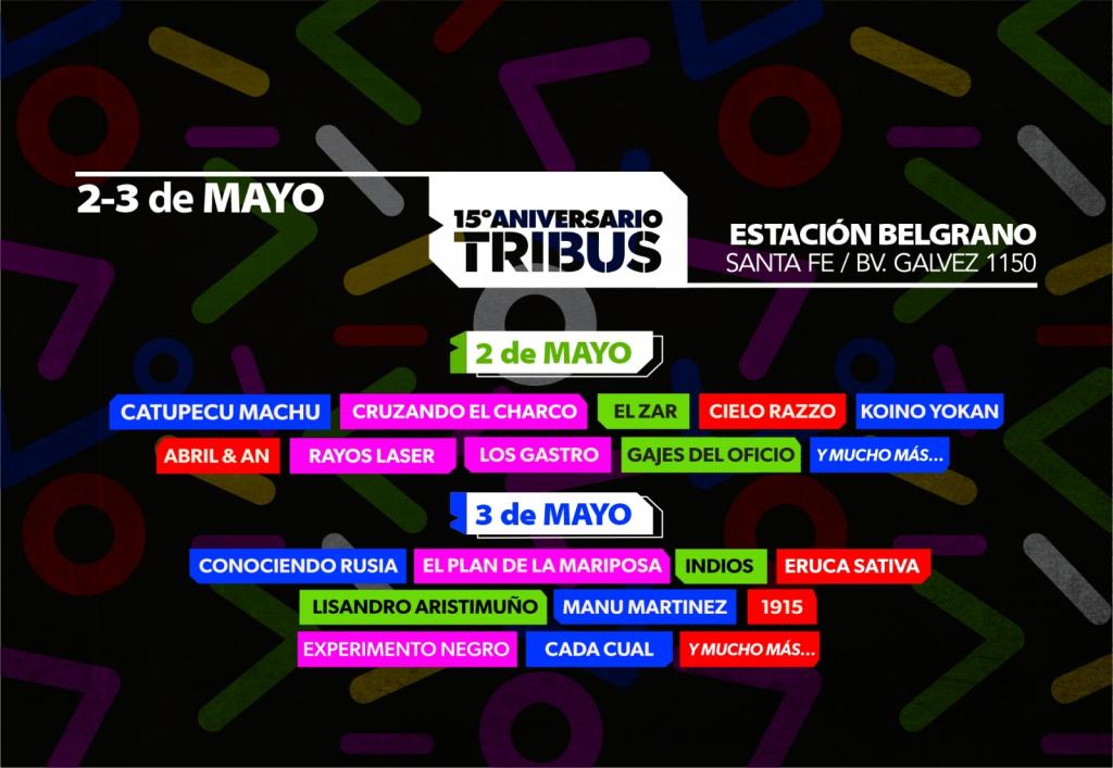 Tribus Club de Arte festejará sus 15 años en el escenario de la Estación Belgrano el 2 y 3 de mayo con la presentación de bandas nacionales y locales de diversos géneros. Entradas con descuento del 20% y financiación para Afiliados/as ATE.